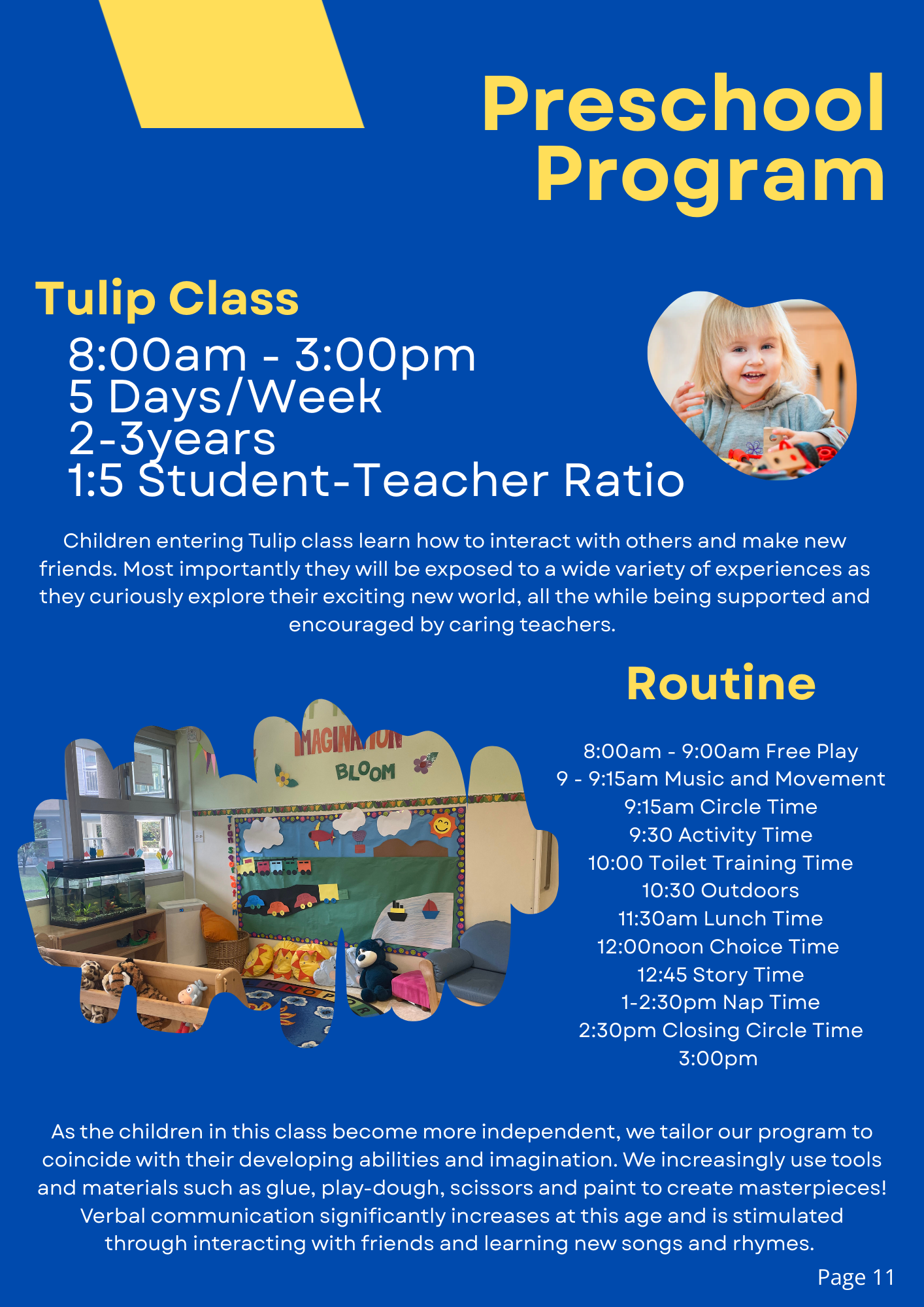 Children entering Tulip class learn how to interact with others and make new friends. Most importantly they will be exposed to a wide variety of experiences as they curiously explore their exciting new world, all the while being supported and encouraged by caring teachers.